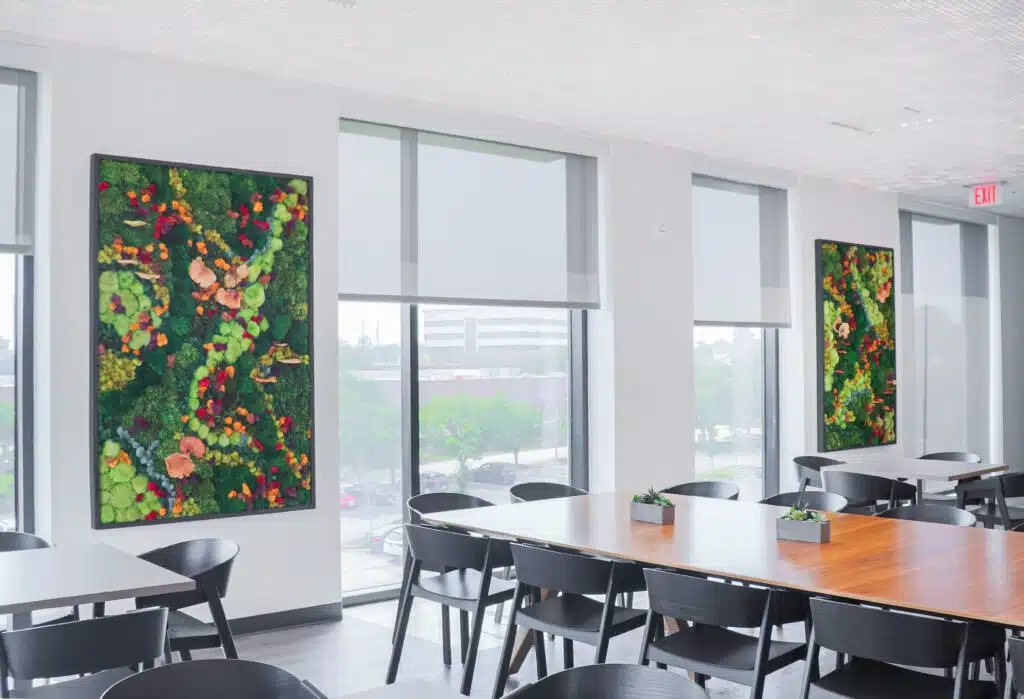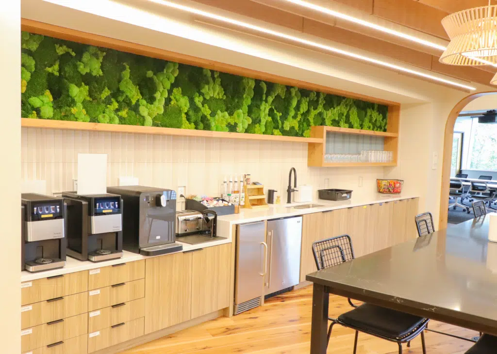 When collaborating with our client to enhance their new office, we designed a unique plantscape featuring a living wall, moss walls, over 20 diverse planters, and geometric prisms with air plants. The installation highlights a custom living wall and vibrant moss art in the kitchen, carefully curated to complement the existing office décor. By utilizing a wide variety of plants, including orchids, succulents, and sansevieria, the design ensures every corner of the workspace feels organic, creative, and full of life.