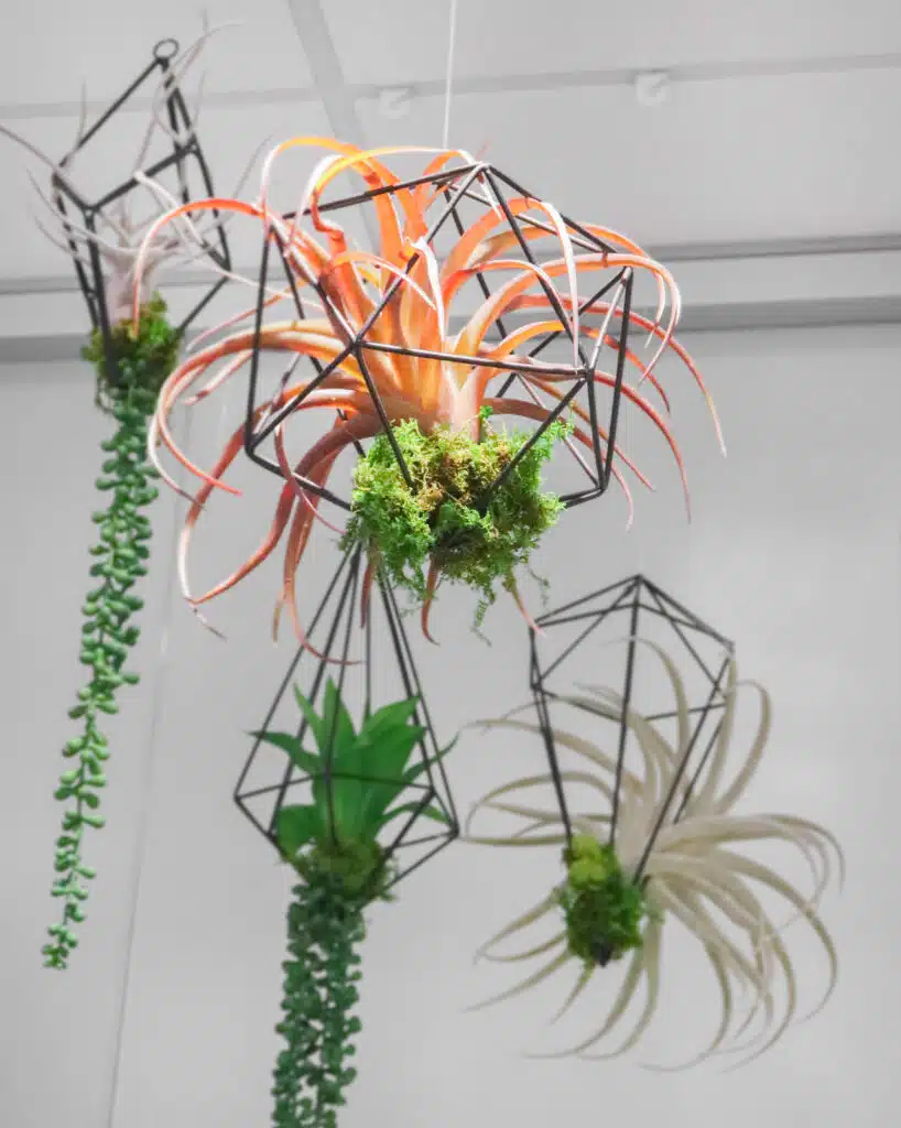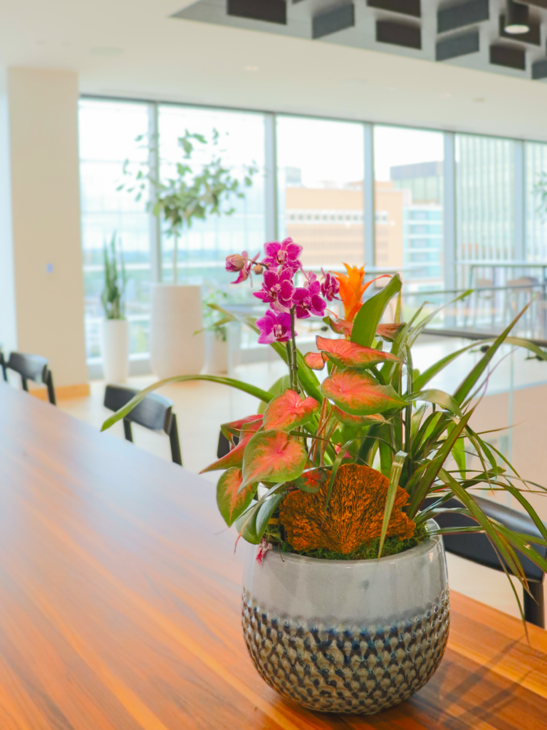 To enhance our client’s office with creative flair, we curated a custom plantscape that prioritizes variety over repetition. This design includes a color bowl, three orchids, almost 30 prisms with air plants, assorted succulents, over 25 planters filled with stunning plants, and two living walls. By hand-picking distinct containers and diverse greenery for every corner, we created an organic, modern workspace that perfectly accents the office’s architecture and artwork.