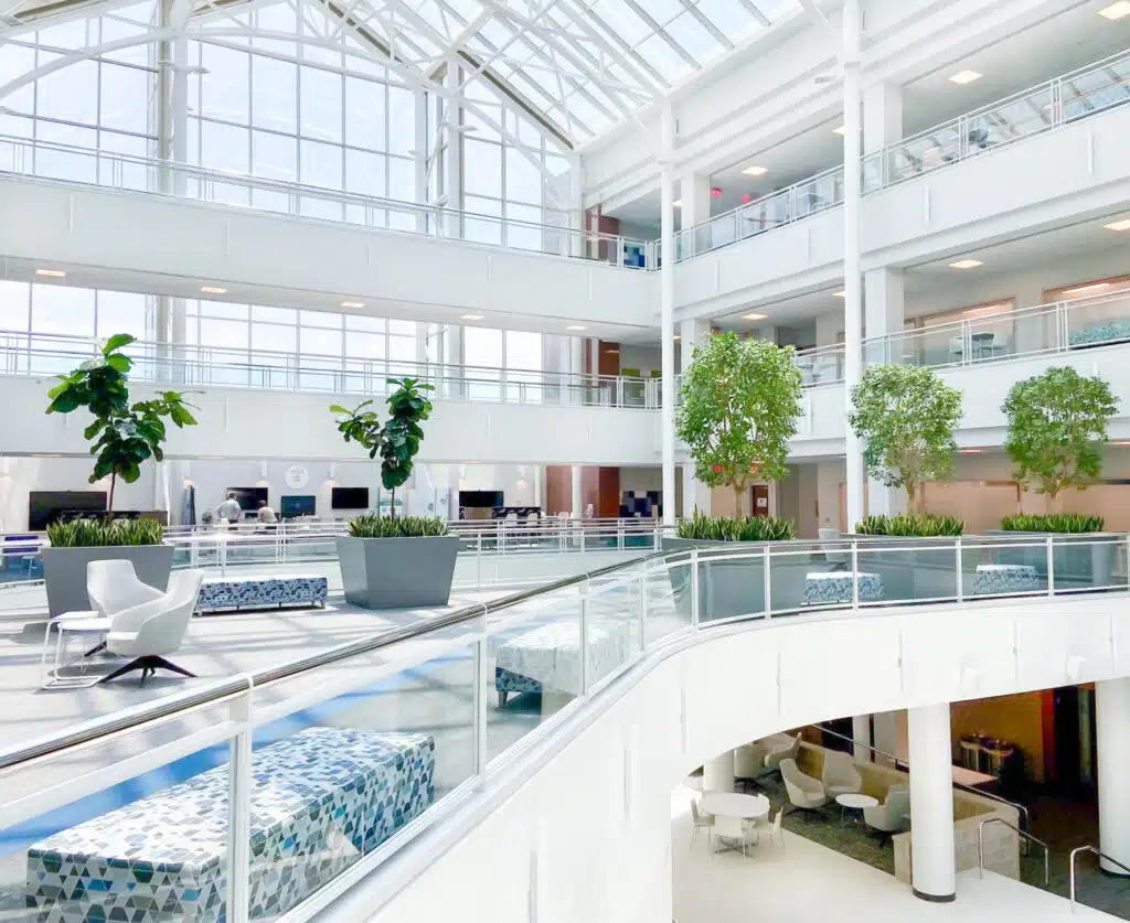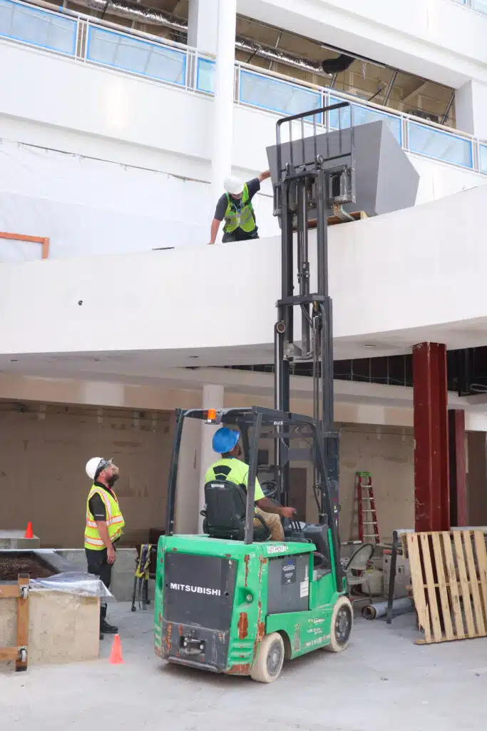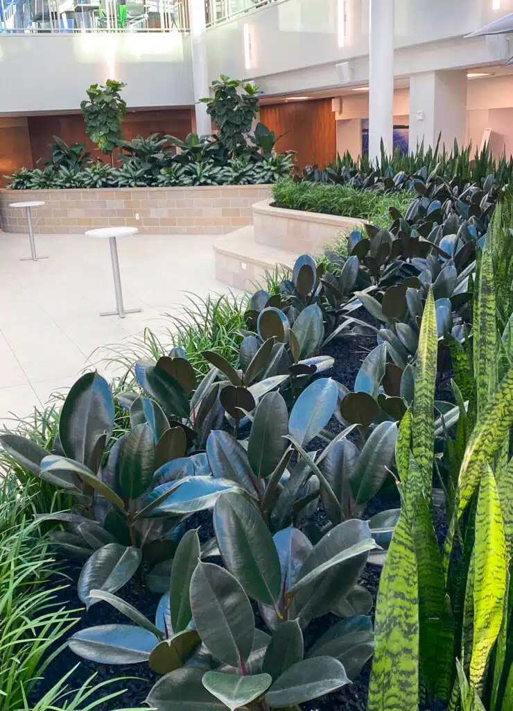 For this downtown atrium renovation, we coordinated a multi-phase installation to protect the greenery from construction dust, beginning with the strategic delivery of 2,500 cubic feet of soil using a mix of forklifts and conveyor belts. Once the site was cleared, we planted five large beds with a lush mix of grasses, Sansevieria, and Ficus elastica, and used specialized equipment to place 20 large containers along the atrium bridge. The final result is a massive, tiered landscape featuring everything from delicate underplantings to large trees, seamlessly integrated into the newly revitalized space.