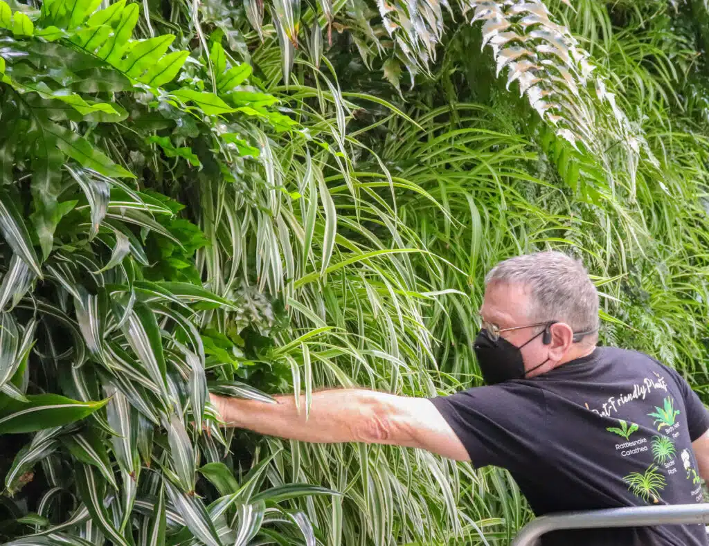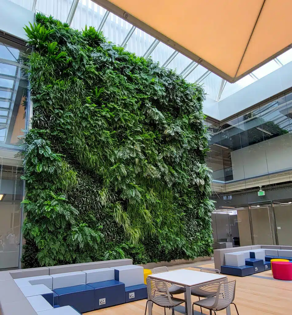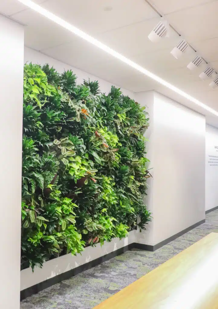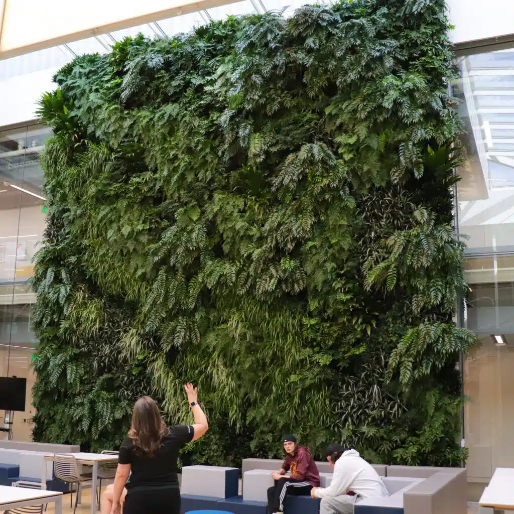 This impressive 30’ x 30’ living wall serves as a serene focal point for university study and events, featuring over 5,300 real plants maintained by a dedicated two-person technical team. To ensure the health of this massive asset, technicians spend 30 hours a month meticulously inspecting each plant and managing a sophisticated, five-zone irrigation system tailored to varying light levels. This commitment to expert horticultural care and safety has earned the wall and our team high praise from the university, cementing its reputation as a beautifully preserved architectural centerpiece.
