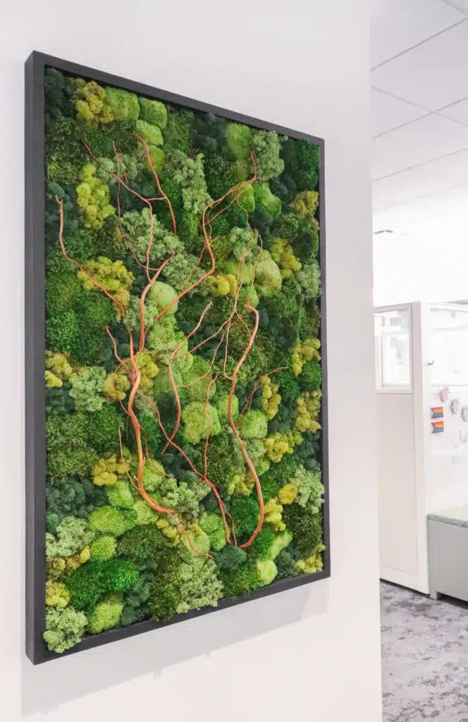 Our team transformed this vibrant downtown office into a serene sanctuary by adding two stunning moss walls and strategically placed containers. This design's highlight is a captivating 12' x 8' moss wall featuring a variety of reindeer moss in eye-catching hues. This moss wall was fabricated by our team. A subtle yet impactful sign reading "Powering the world with knowledge" is seamlessly integrated into the design, creating a visually striking focal point.