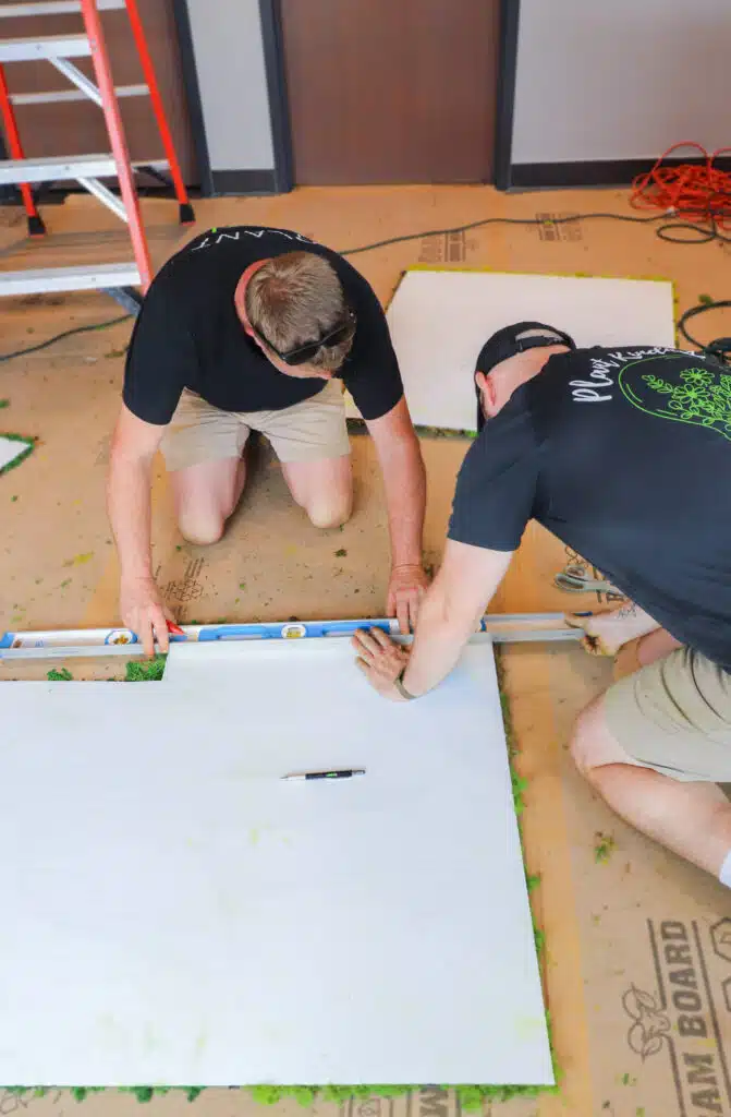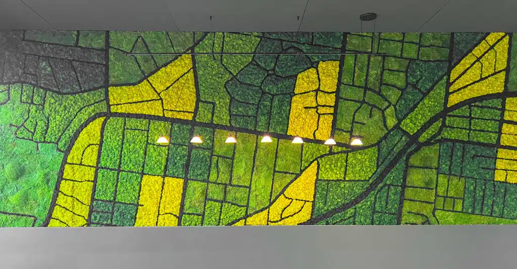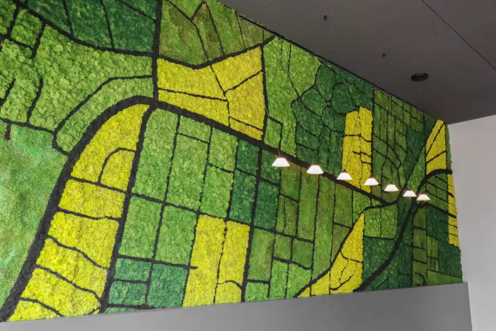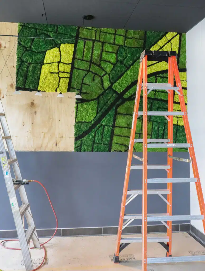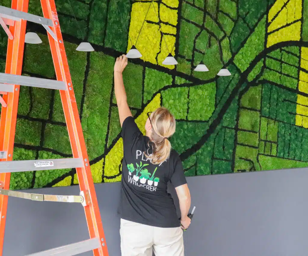 To bring a coffee shop’s local map to life, we created an 18-foot-wide moss wall using black reindeer moss for streets and varying green mosses for city blocks. By pioneering a new technique of printing the intricate street design onto corrugated plastic, our team achieved high levels of accuracy and detail. Despite unexpected site challenges, including incorrect wall dimensions and early-installed lighting, we custom-fitted the 12-piece map on-site to ensure a seamless, professional finish that serves as a stunning focal point for guests.
