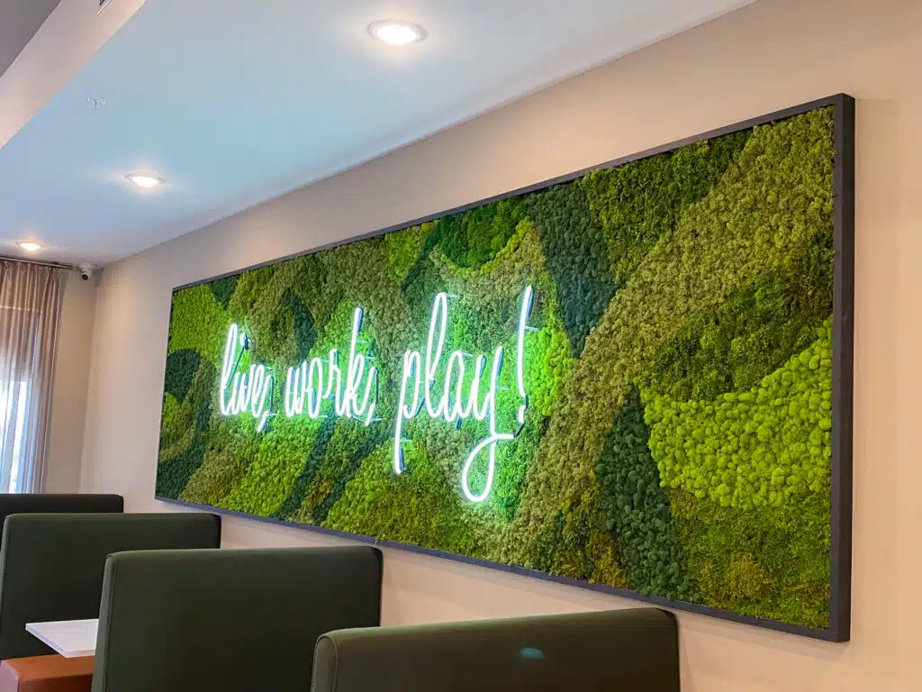 This 18' x 5' custom moss wall transformed a blank common area in an apartment building into a vibrant social hub. Inspired by the client’s "live, work, play!" neon sign, the design rejects straight lines in favor of playful curves and a rich variety of textures, including reindeer and mood moss. Despite installation challenges involving precise height adjustments around furniture, the wall remains a durable focal point, maintained every few months to ensure the tactile, multi-colored display stays as pristine as the day it was created.