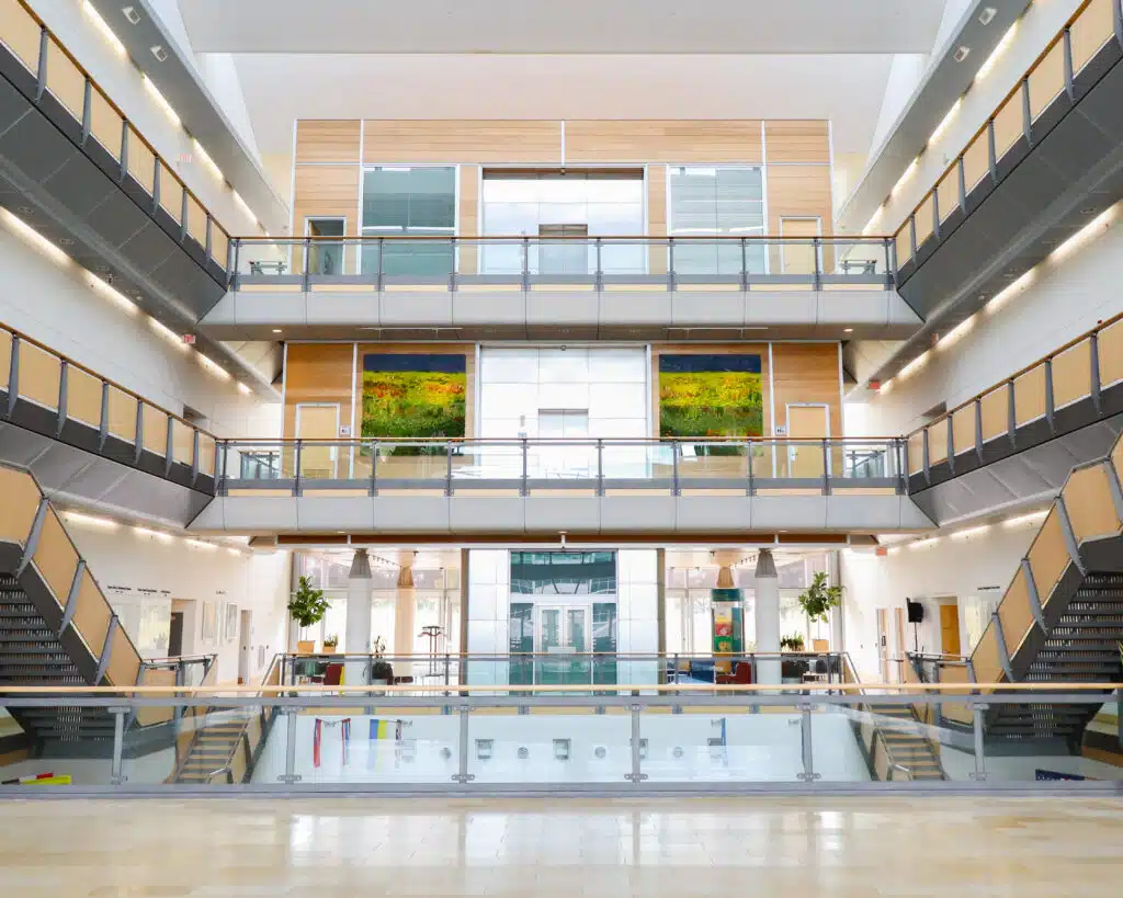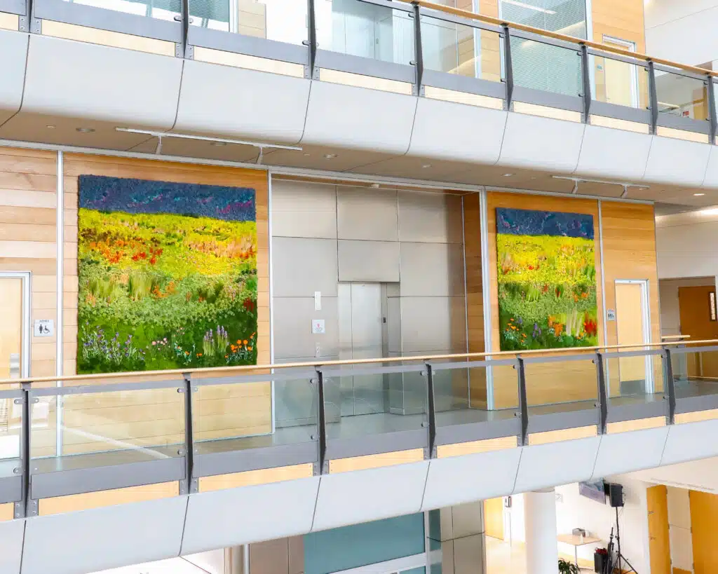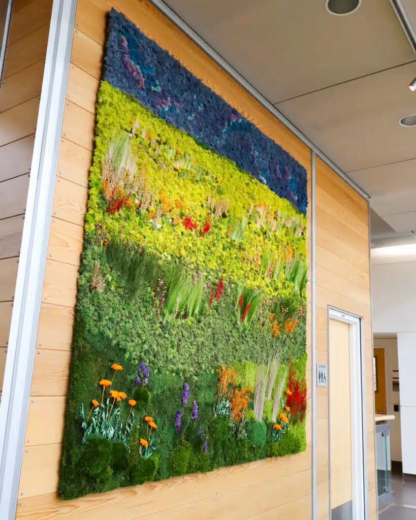 Flanking the elevators of a multi-floor atrium, these dual 8' x 8' moss walls serve as a symmetrical centerpiece inspired by their prairie. We replaced traditional artwork with a textured blend of preserved moss, dried grasses, and florals to bring the client’s love for the outdoors inside. This collaborative project resulted in two cohesive, commanding art pieces that capture the essence of the natural landscape from every level of the building.